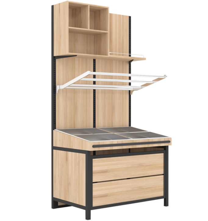 【特點】精選優(yōu)質精品木材打造整體框架,可增配廣告牌分類牌,便于對所陳列的商品進行分類指示,對顧客購物形成有效引導,提升顧客購物體驗。